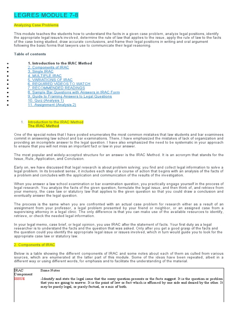 Issue, rule, application, and conclusion. The irac method helps break down complex terminology, fact patterns, and legal analysis into easier to understand blocks of text. First, start with a sentence that identifies the legal issue that you. Irac well explained by the law assignment writing expert at my assignment services. The irac method is a legal analysis method used in most law schools. The irac method helps break down complex terminology, fact patterns, and legal analysis into easier to understand blocks of text. 2 the irac method is not for all types of questions. The irac methodology can also be used to summarize a legal opinion and prepare a case brief. This was the case first sexual harassment lawsuit to receive class action certification in 1988 defining the class to include: Irac is a tool used for communicating legal concepts and conclusions, not for reaching those conclusions. And what's a legal analysis without an irac methodology? Eveleth taconite co federal and state governments have enacted laws to protect against discrimination and sexual harassment in the work place yet employers continue to discriminate and violate employee's right to work in a. If you've got a discuss the the advantages and disadvantages of indefeasibility in property law kind of question.